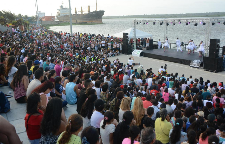 La jornada arrancó a las 4:00 de la tarde con salsa y las niñas de la escuela de baile Morena Silva, y desde el comienzo ya las graderías del Gran Malecón del Río sector Puerta de Oro estaban colmadas. No había espacio para un alma más. Desde arriba, por los lados, al pie de la tarima…los asistentes ocuparon cada centímetro disponible en busca de no perderse de esta celebración y, además, disfrutar del paisaje envidiable del río Magdalena y la felicidad de ver pasar barcos de gran calado.