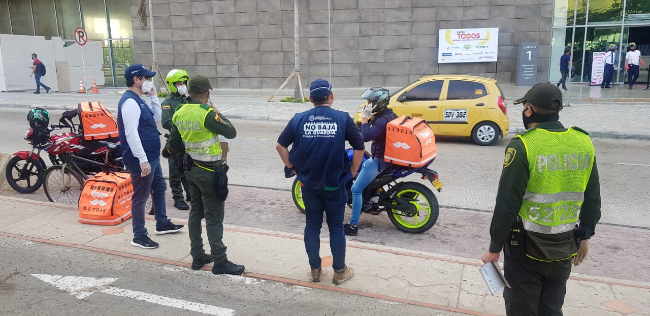 En la jornada, el equipo de reacción inmediata, conformado por la Secretaría de Gobierno, Secretaría de Salud, Secretaría de Control Urbano y Espacio Público y la Oficina de Seguridad y Convivencia Ciudadana, aplicó 20 comparendos a personas encargadas de entrega de domicilios, por no tener los elementos de protección personal.