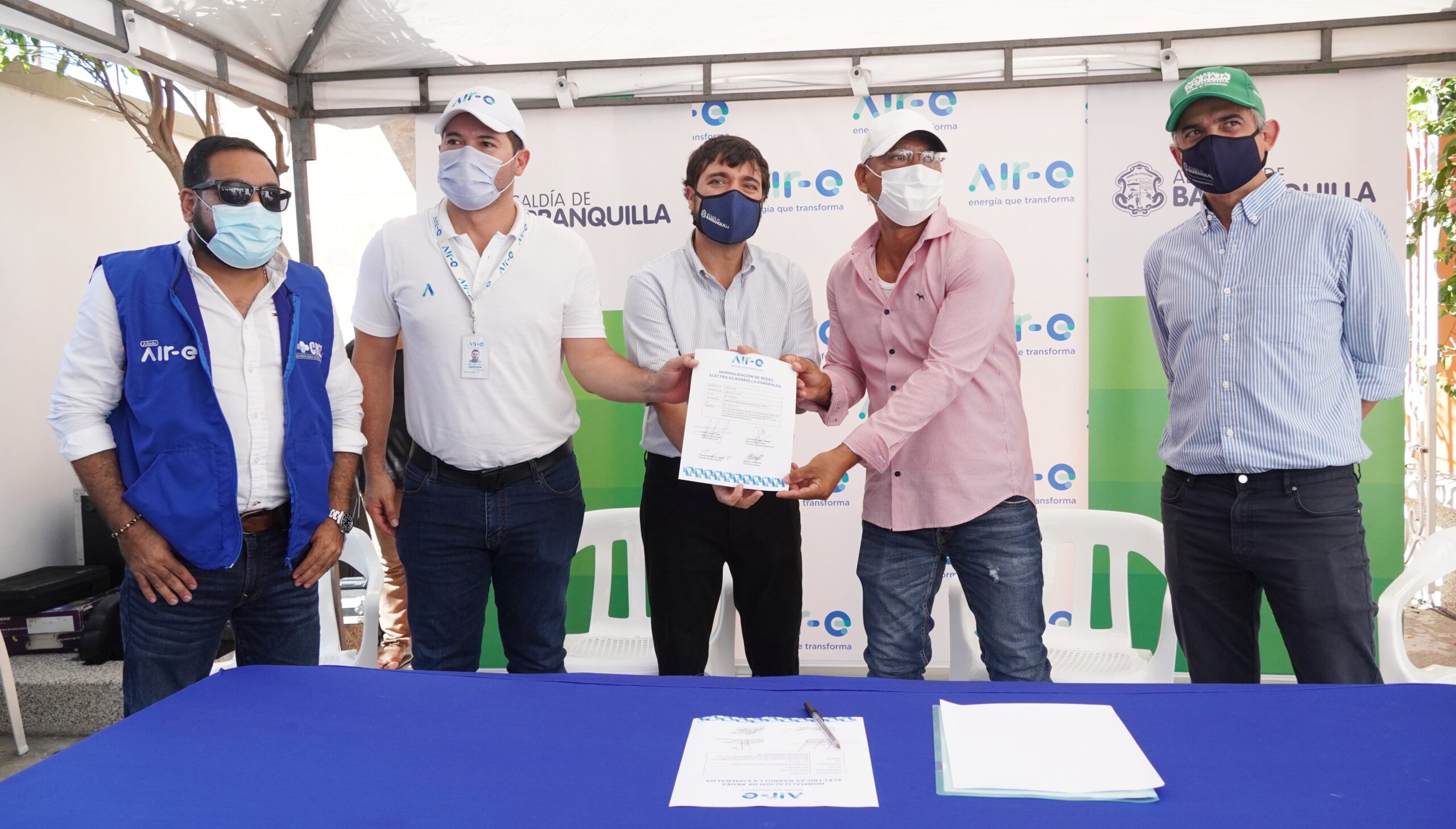 Con la presencia del alcalde Jaime Pumarejo Heins y el gerente general de la empresa Air-e, Jhon Jairo Toro, se firmó el contrato de obras para la normalización eléctrica del barrio La Esmeralda.