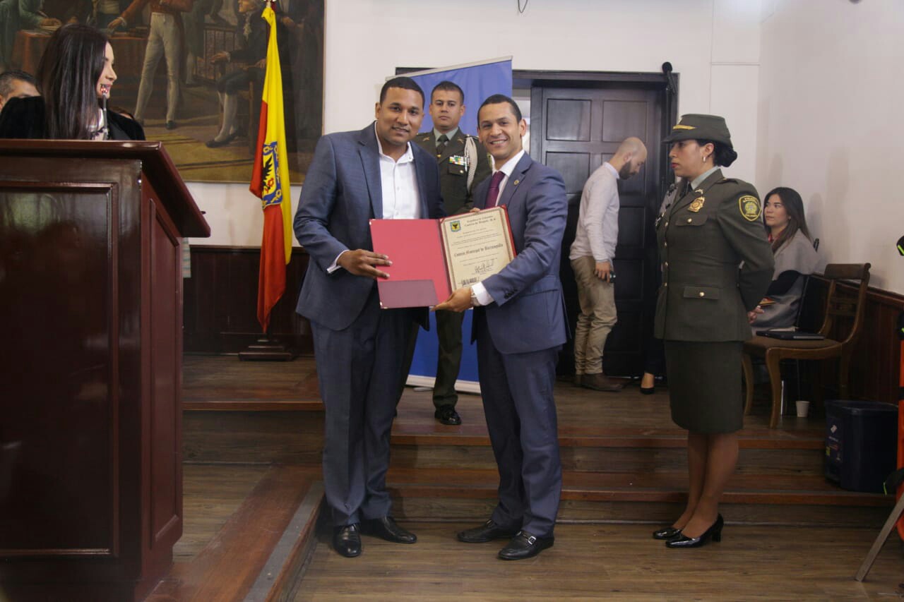 El presidente Oscar David Galán quien estuvo acompañado en su visita del segundo vicepresidente de la corporación, Juan Camilo Fuentes, recibió en nota de estilo un reconocimiento de manos del Concejal Daniel Palacios, presidente de la mesa directiva del Concejo de Bogotá.