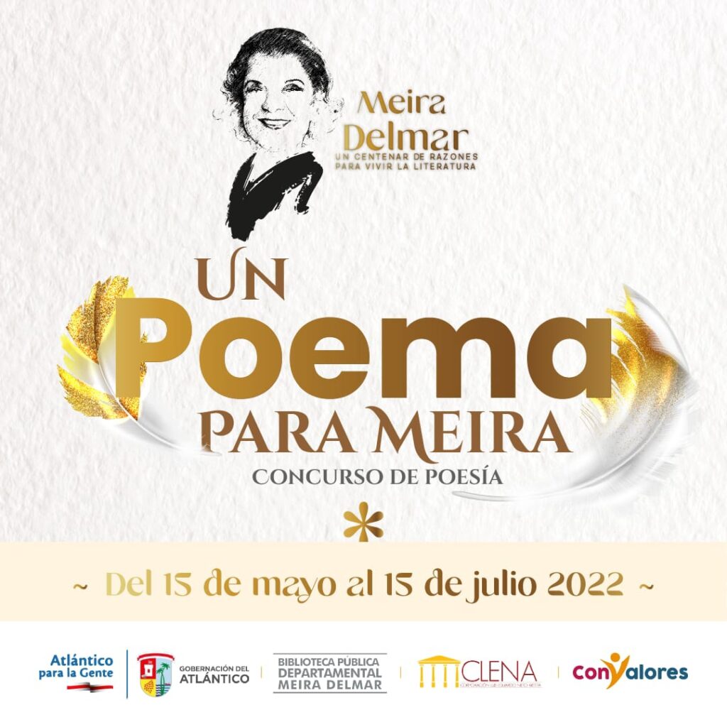 El centenario del natalicio de Meira Delmar se ha convertido en una oportunidad para destacar su obra y legado, es por esto que la Gobernación del Atlántico y la Biblioteca Pública Departamental Meira Delmar invitan a la creación literaria con el concurso de poesía ‘Un poema para Meira’. La convocatoria está abierta desde este 15 de mayo hasta el 15 de julio de 2022.